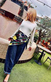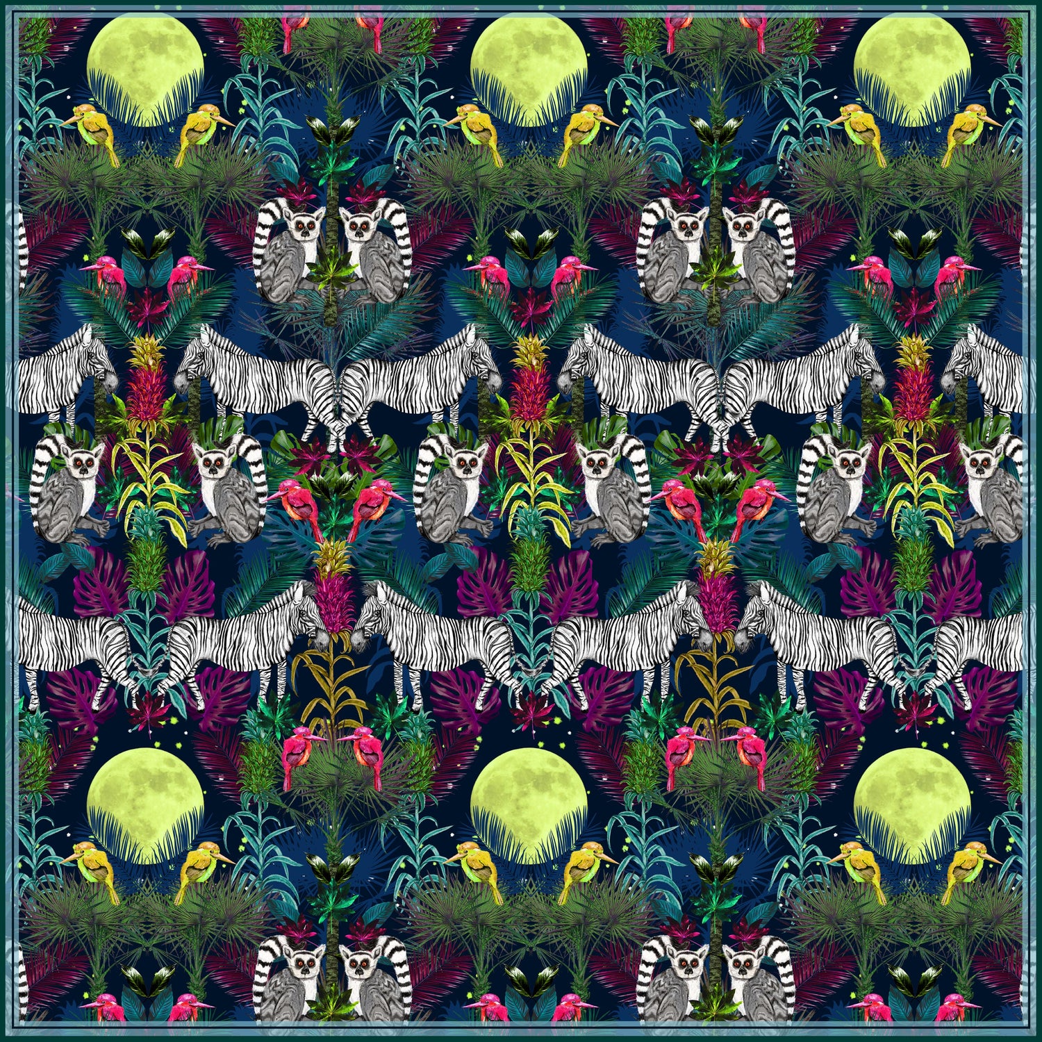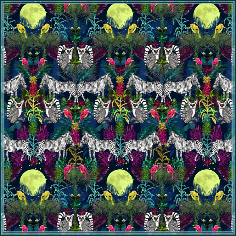 House of Norris introduces "Under the Neon Moon" An explosion of colour with an array of tropical foliage and fauna in a mirrored format. The Zebra, the Lemur Monkey and the birds with the palm trees depict a night under the fluorescent moon in Zambia with a celebration of fire pineapples.