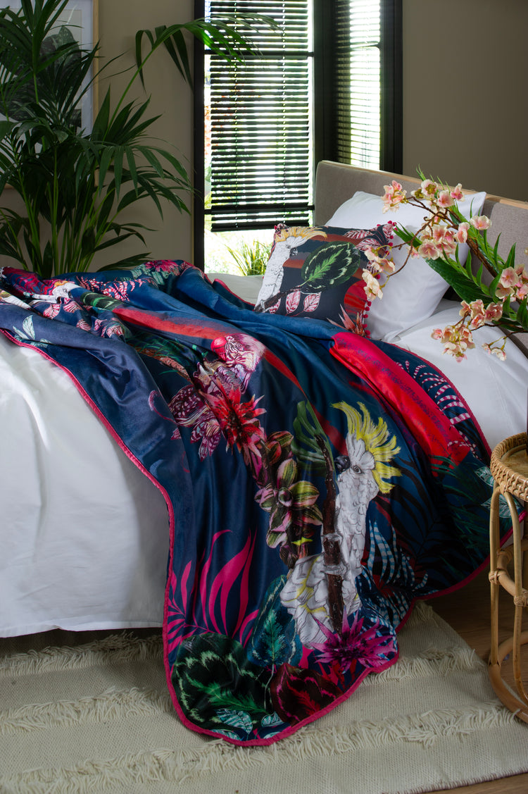 Take a walk in paradise with this beautiful velvet padded throw/bedspread. Get cosy on those nights in snuggled on the sofa! The inner padding makes for extra comfort and the velvet feels so soft and smooth on the skin. The design is a dark moody tropical design that works with any interior.