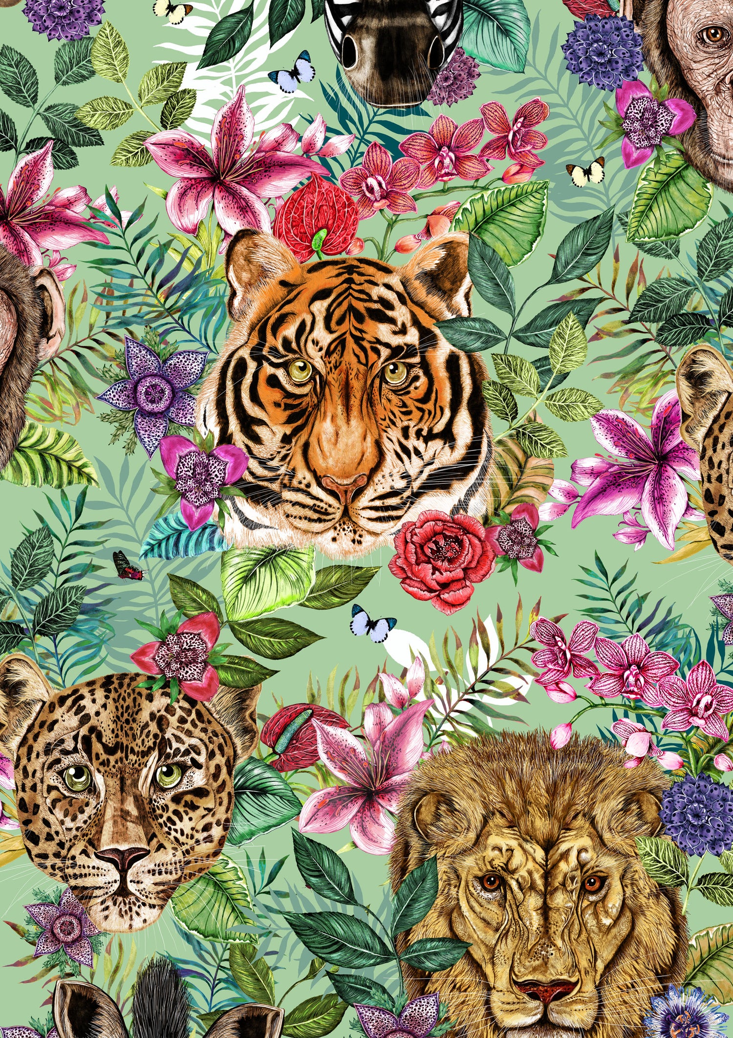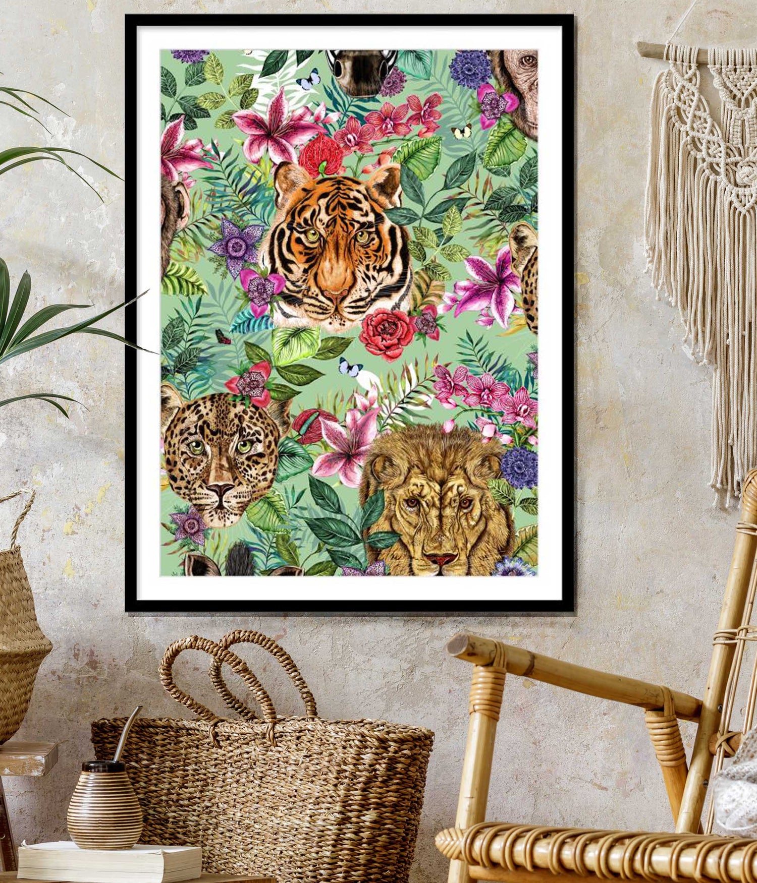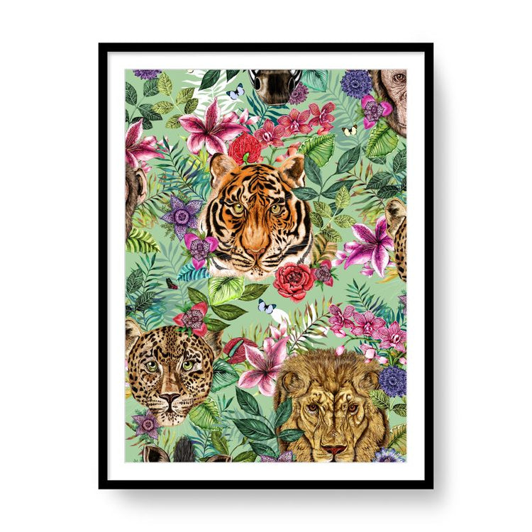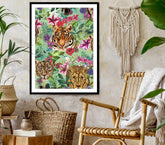 House of Norris introduces their newest collection, the Totem Collection. Totems can be animals, plants, or natural objects that are believed to have spiritual significance. The animal heads watch over you and their spirit will keep you safe from harm. This collection depicts glorious tropical animal heads surrounded by beautiful flowers and foliage. This is a framed or unframed art print giclee printed on textured matte fine art paper.  Available in varied sizes.