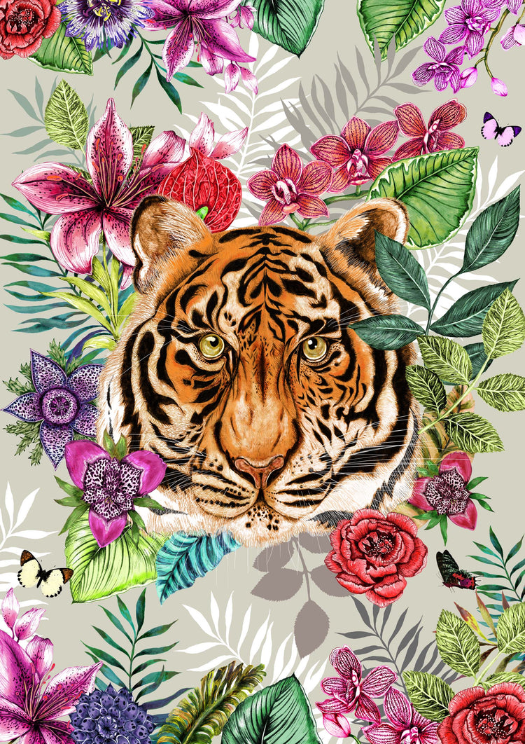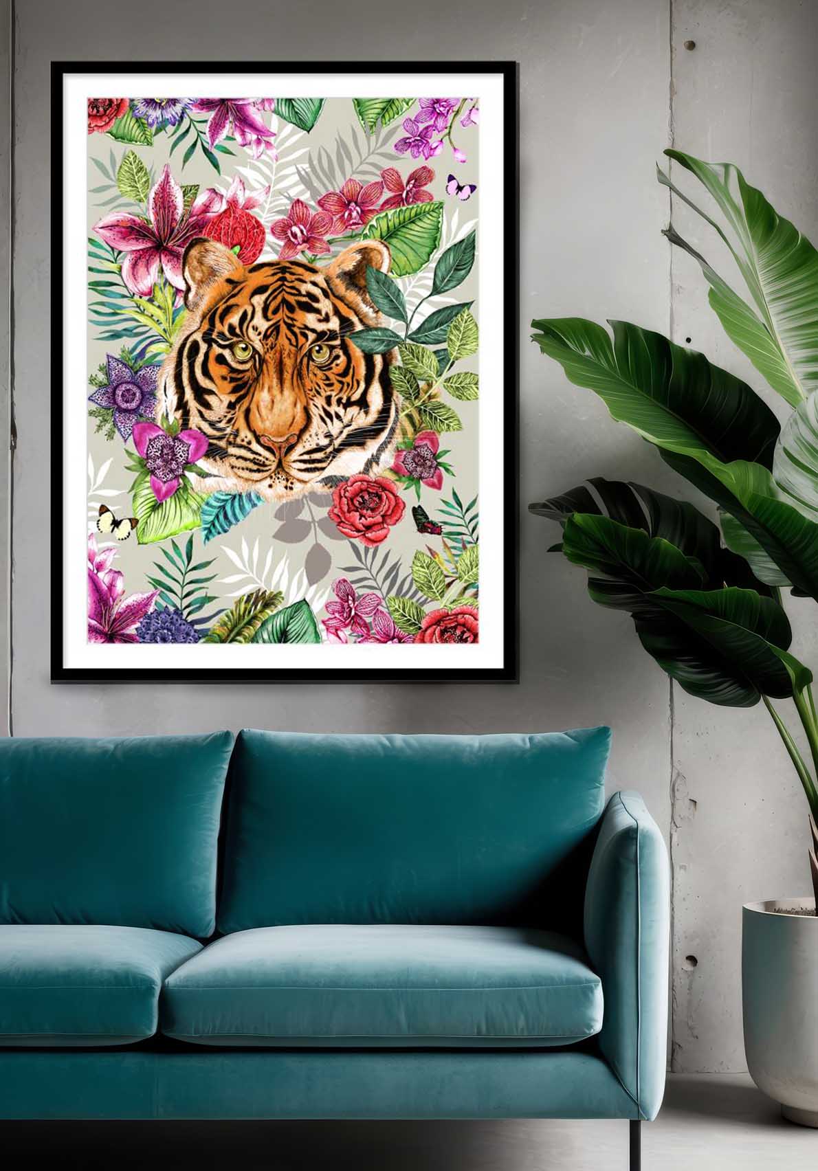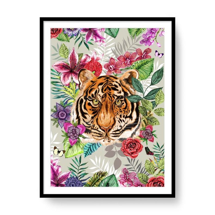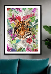 House of Norris introduces their newest collection, the Totem Collection. Totems can be animals, plants, or natural objects that are believed to have spiritual significance. The animal heads watch over you and their spirit will keep you safe from harm. This collection depicts glorious tropical animal heads surrounded by beautiful flowers and foliage. This is a framed art print giclee printed on textured matte fine art paper.