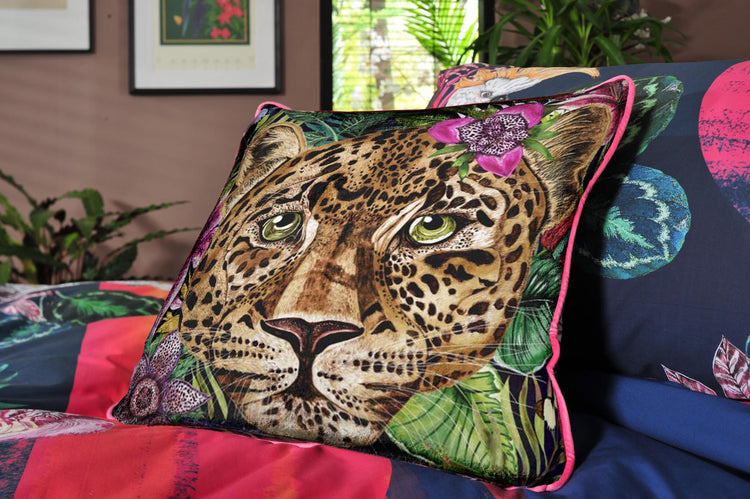 House of Norris introduces their newest Collection, the Totem Collection. Totems can be animals, plants, or natural objects that are believed to have spiritual significance. The animal heads watch over you and their spirit will keep you safe from harm. This collection depicts glorious tropical animal heads surrounded by beautiful flowers and foliage to create an exotic and dramatic effect within your home. Get tropical with this luxury velvet cushion.