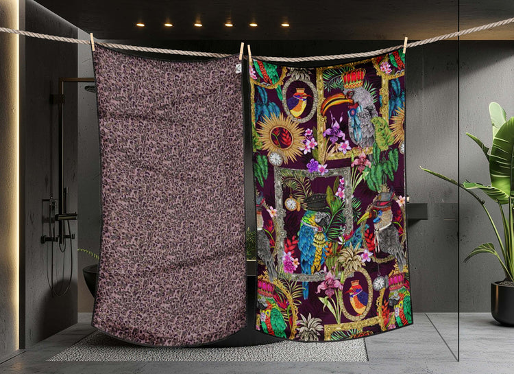 Introducing our House of Norris "The Quirky Bird" design. The design is all about being comfortable being who you are, with no care for what others think of you. If people don't like your dress sense or the way you express yourself then who cares- do not judge others and you cannot be judged yourself. This is a luxury tropical bird beach towel with a leopard print reverse.