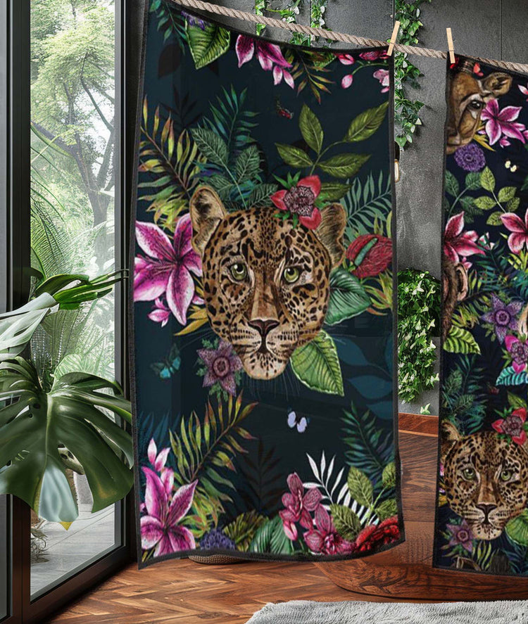 House of Norris introduces their newest collection, the Totem Collection. Totems can be animals, plants, or natural objects that are believed to have spiritual significance. The animal heads watch over you and their spirit will keep you safe from harm. This collection depicts glorious tropical animal heads surrounded by beautiful flowers and foliage. This is a luxury beach towel with a tropical twist.