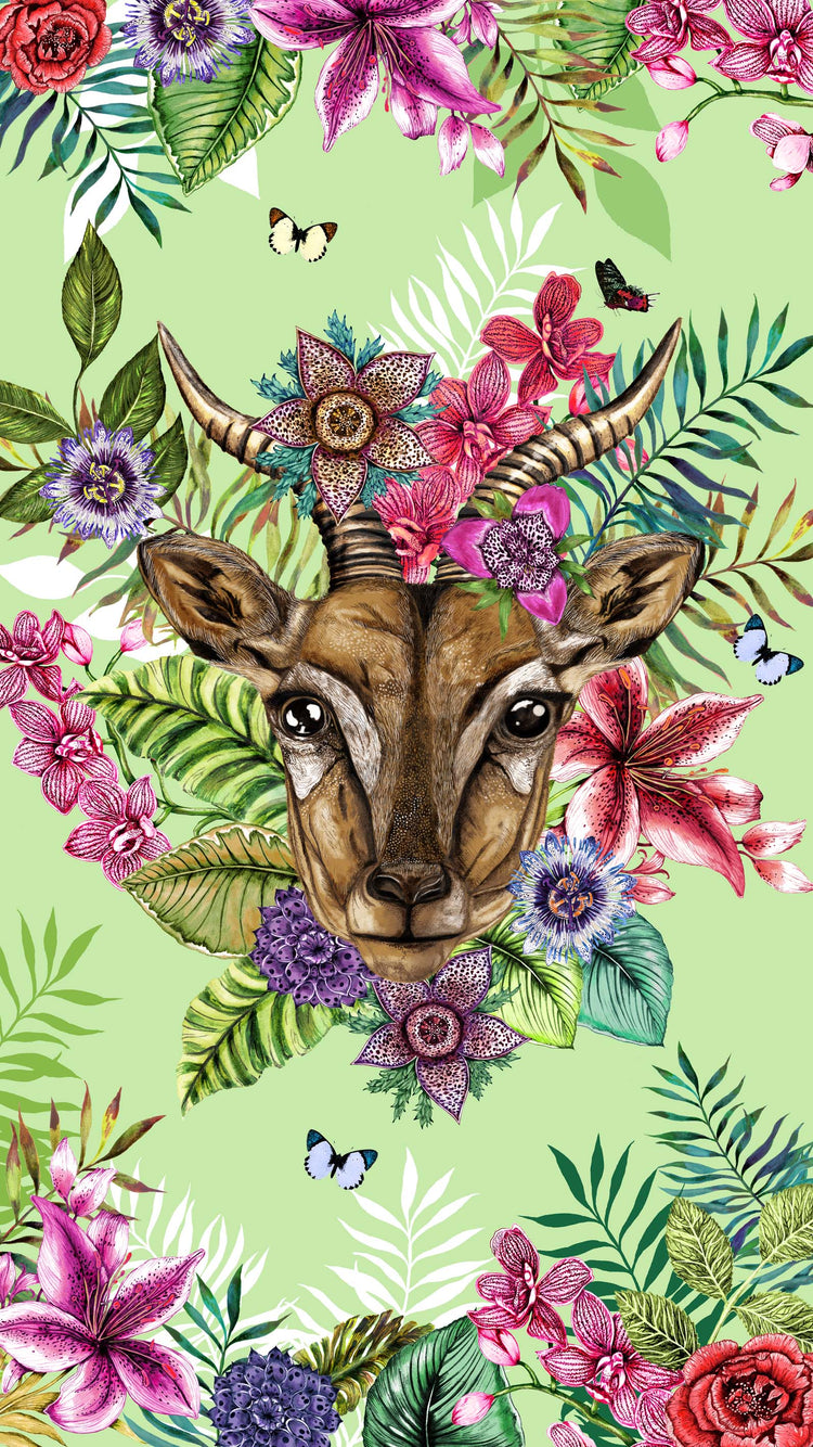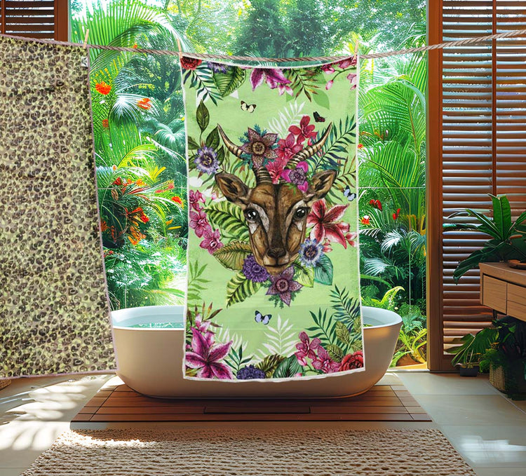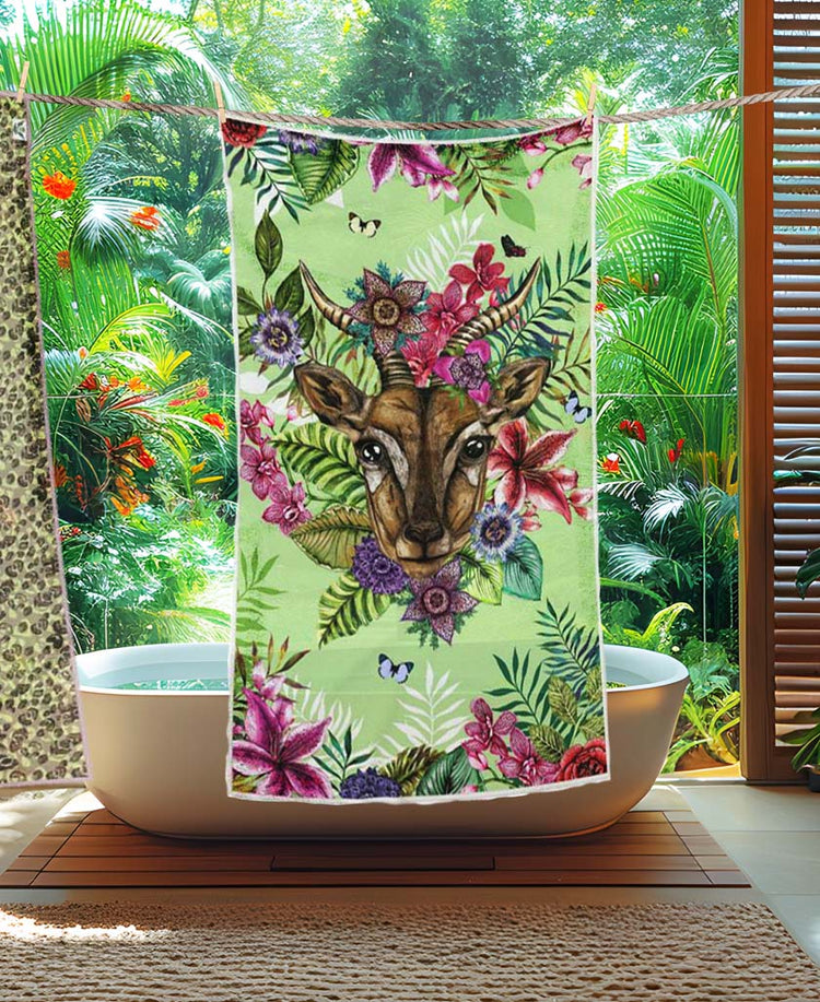House of Norris introduces their newest collection, the Totem Collection. Totems can be animals, plants, or natural objects that are believed to have spiritual significance. The animal heads watch over you and their spirit will keep you safe from harm. This collection depicts glorious tropical animal heads surrounded by beautiful flowers and foliage. This is a luxury gazelle tropical beach towel.