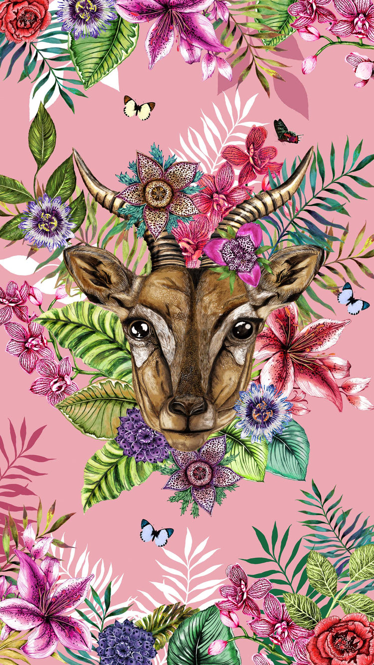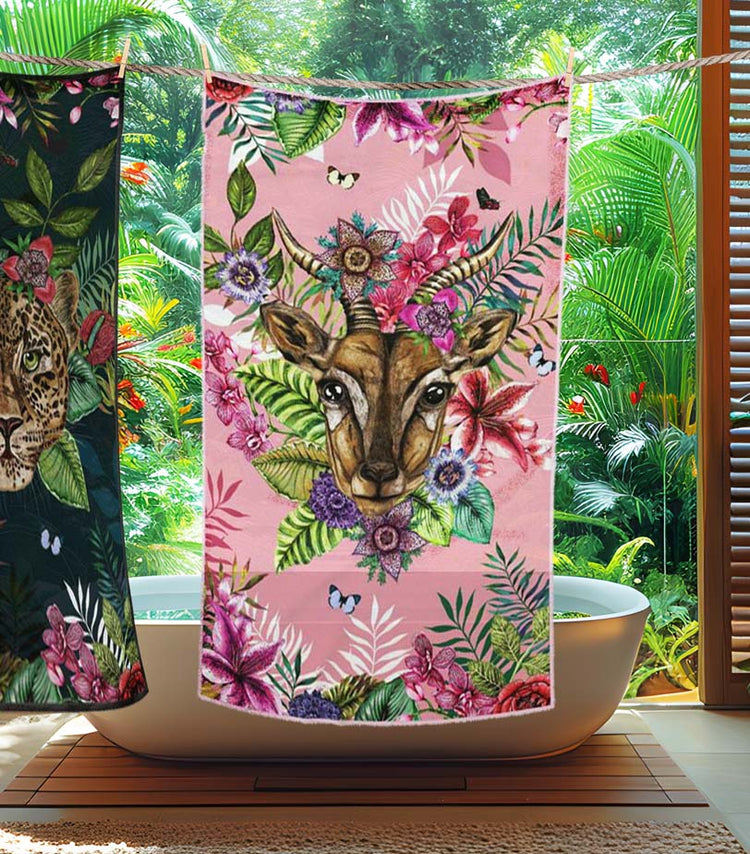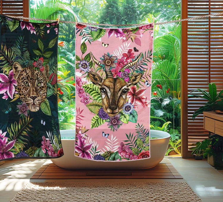 House of Norris introduces their newest collection, the Totem Collection. Totems can be animals, plants, or natural objects that are believed to have spiritual significance. The animal heads watch over you and their spirit will keep you safe from harm. This collection depicts glorious tropical animal heads surrounded by beautiful flowers and foliage. This is a luxury gazelle tropical beach towel.