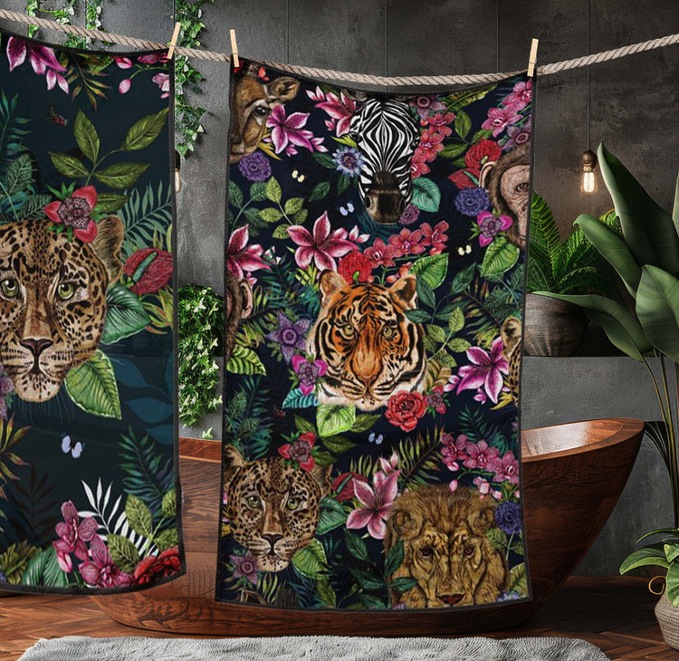 House of Norris introduces their newest collection, the Totem Collection. Totems can be animals, plants, or natural objects that are believed to have spiritual significance. The animal heads watch over you and keep you safe from harm. This is a luxury animal heads beach towel with a tropical twist, with a beautiful leopard print reverse.
