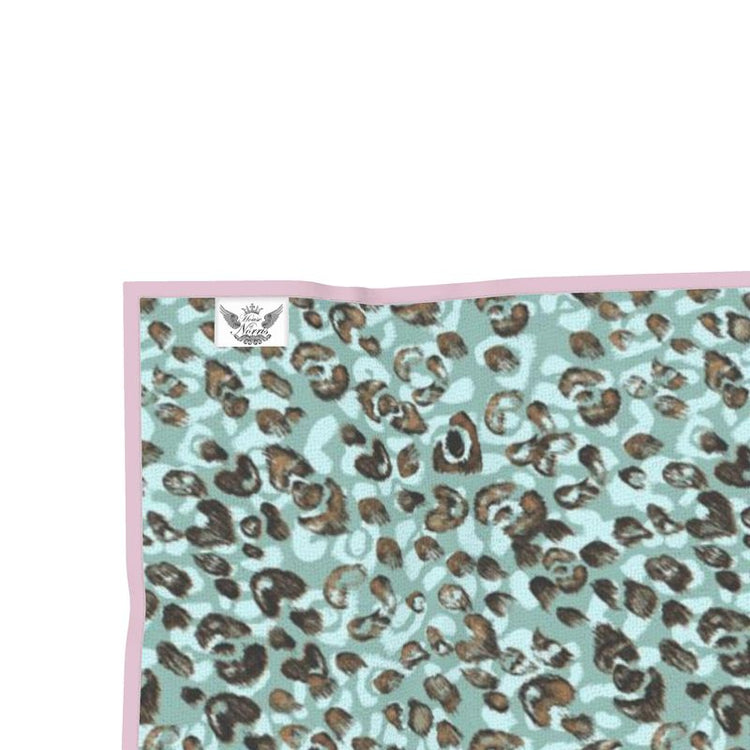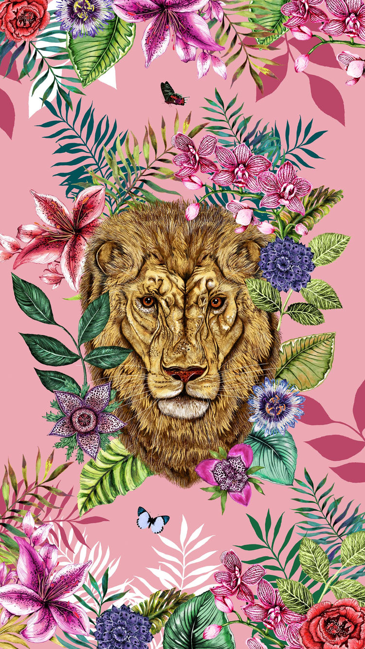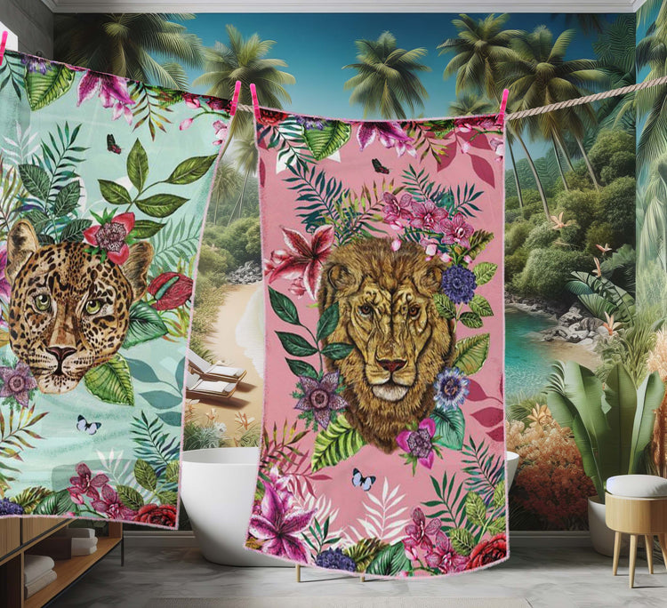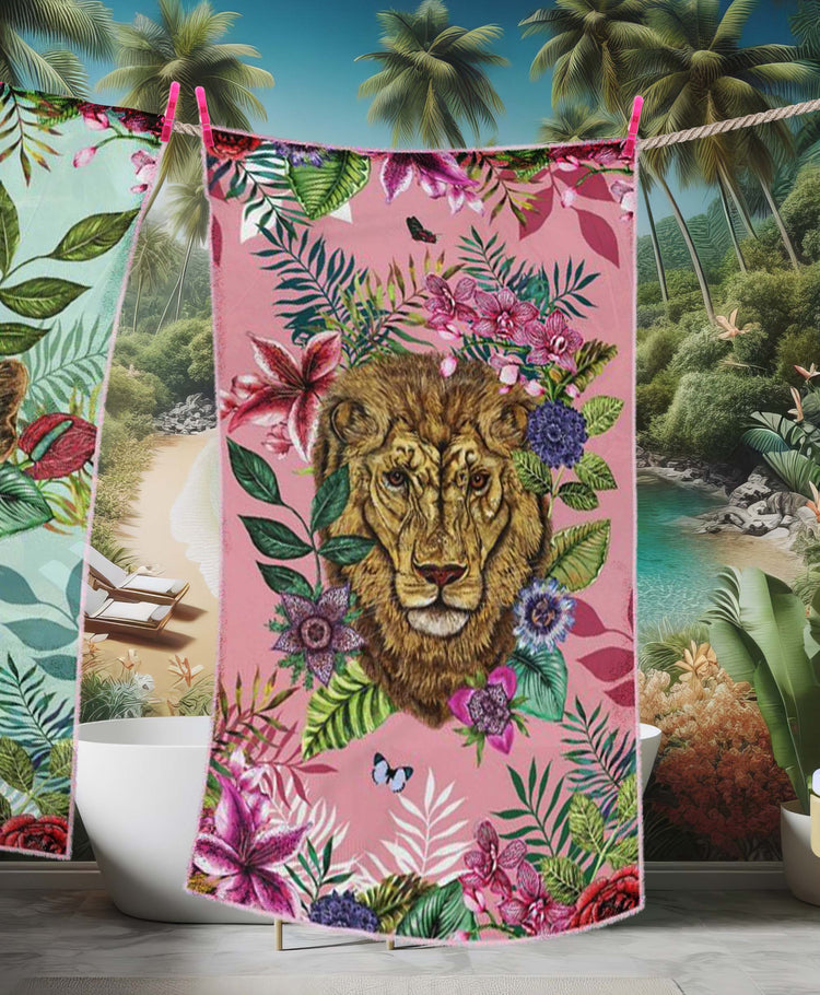 House of Norris introduces their newest collection, the Totem Collection. Totems can be animals, plants, or natural objects that are believed to have spiritual significance. The animal heads watch over you and their spirit will keep you safe from harm. This collection depicts glorious tropical animal heads surrounded by beautiful flowers and foliage. This is a luxury lion tropical beach towel with a beautiful leopard print reverse .