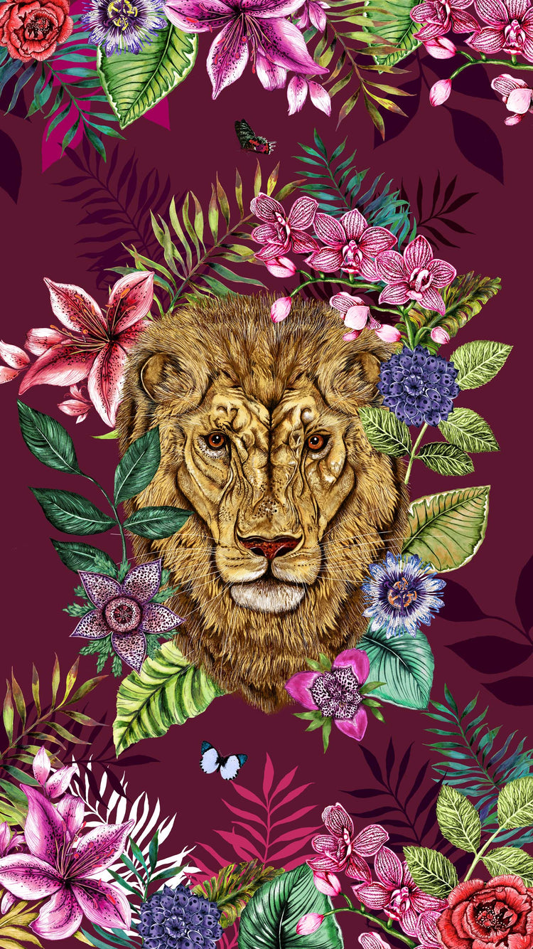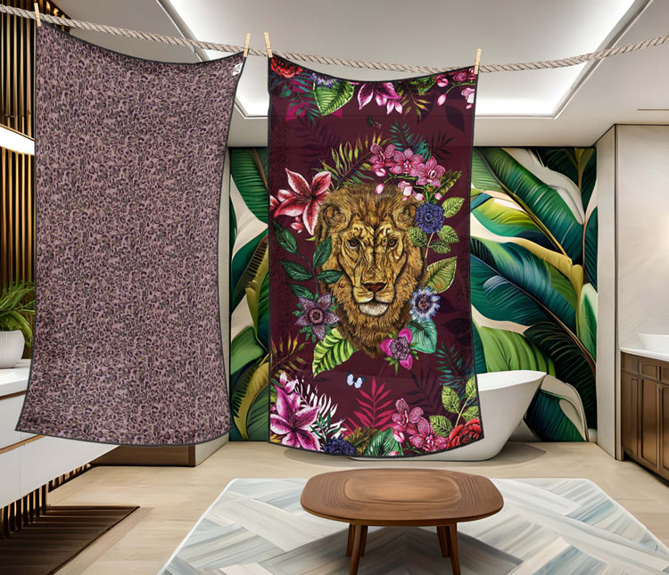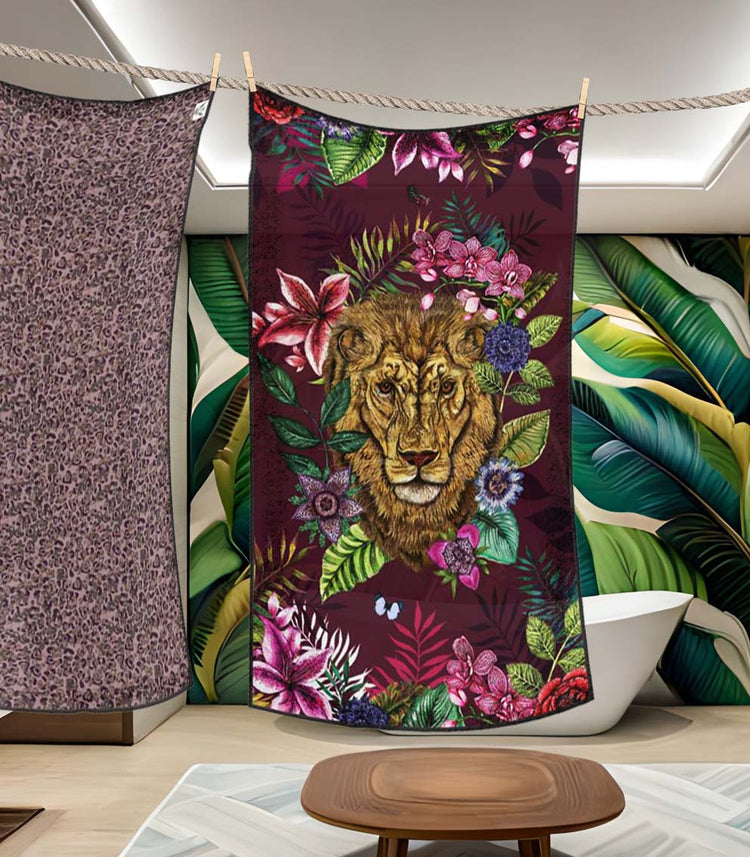 House of Norris introduces their newest collection, the Totem Collection. Totems can be animals, plants, or natural objects that are believed to have spiritual significance. The animal heads watch over you and their spirit will keep you safe from harm. This collection depicts glorious tropical animal heads surrounded by beautiful flowers and foliage. This is a luxury lion tropical beach towel.