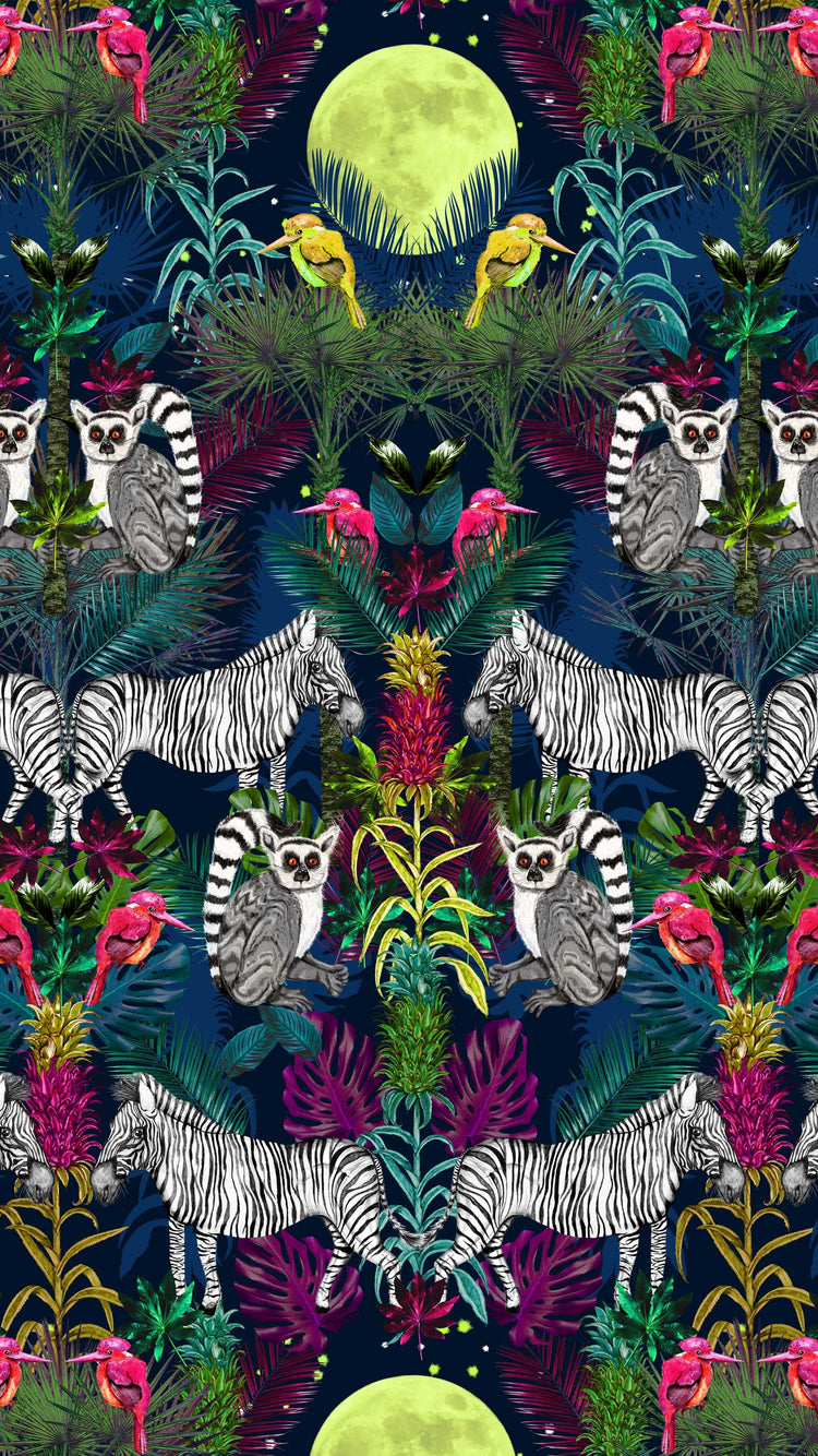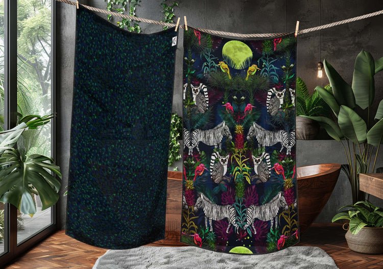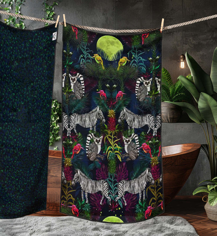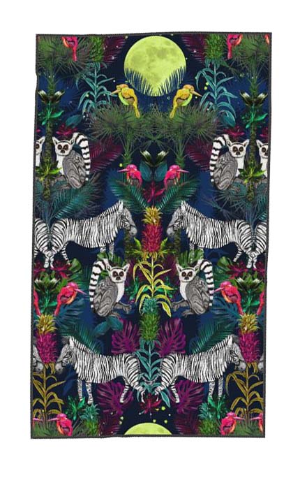 House of Norris introduces "Under the Neon Moon" An explosion of colour with an array of tropical foliage and fauna in a mirrored format. The Zebra, the Lemur Monkey and the birds with the palm trees depict a night under the fluorescent moon in Zambia with a celebration of fire pineapples. This is a beautiful luxury beach towel.