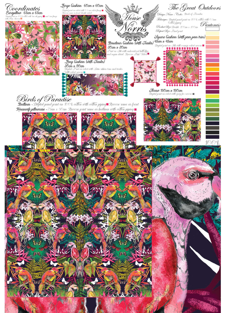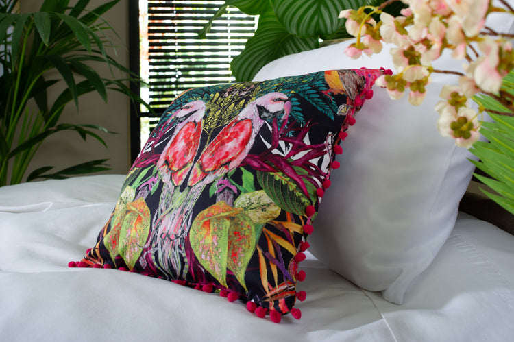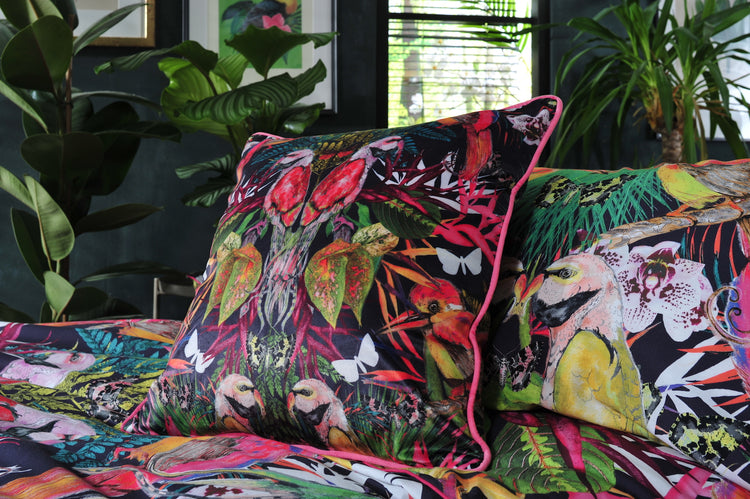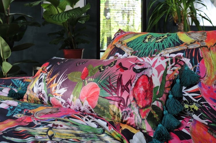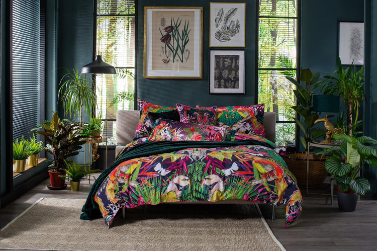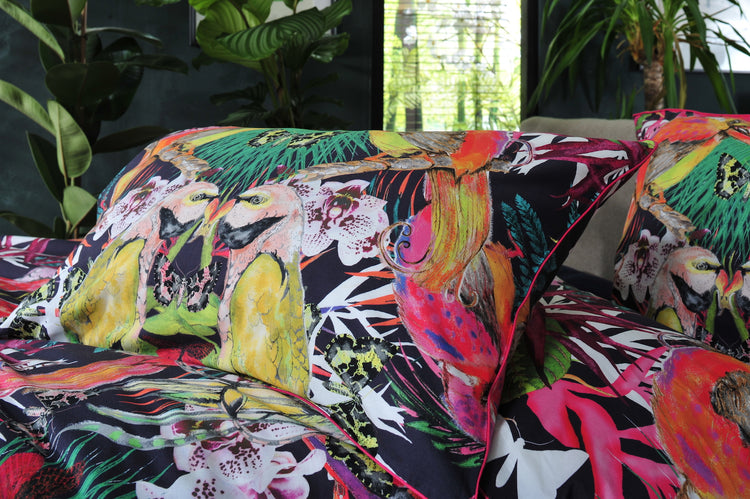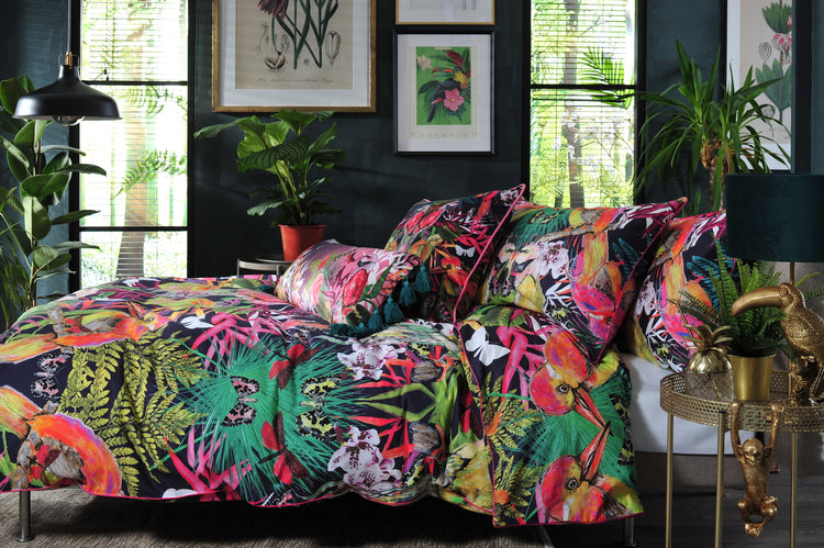Introducing our House of Norris "Birds of Paradise" bedlinen design. Bring paradise into your living area with this stunning tropical bedlinen collection. Deep dark and tropical this set of products for your home will enrich your environment and your bedroom. The collection also features cushions and a throw. The dark background highlights the tropical birds, butterfly's, flowers and foliage making them jump out and feel almost alive.